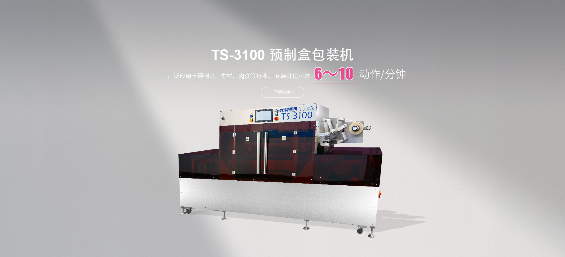 北京大森包裝機械有限公司北京大森承繼總部日本大森機械工業株式會社的優勢資源和先進技術,先后開發和引進了全自動枕式包裝設備、高速裝箱裝盒設備、拉伸膜和自粘膜包裝設備、各式理料線和其他輔助設備,為客戶提供最符合產品實際需求的一體化、個性化整體包裝解決方案與設備,實現從產品研發、采購、生產、售后一站式整體服務,廣泛應用于方便食品、休閑食品、冷凍食品、海產品、醫藥、生鮮果蔬、烘焙等各個行業領域。